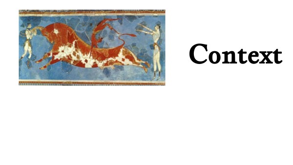 Knossos Bull-Leaping fresco in a Knossos palace. Grecian art focused heavily on the human form. The dynamic positions of the figures paired with the center being of a different ethnic descent shows that this is a piece of novelty and diversity. Which would be enjoyed as a piece not for worship or history lessons, but as entertainment. While the artist is unknown, knowing the piece was found in a palace suggests they would have been of relatively high status. One can assume this piece was meant to last as it is a fresco, meaning it is painted atop wet plaster, making it a part of the wall. The piece dates back to 1700 to 1500 BCE, which means "very old", so the technique did it's job.