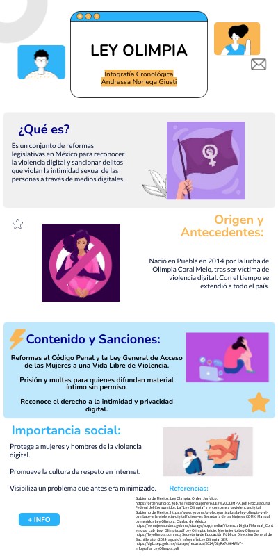 Gobierno de México. Ley Olimpia. Orden Jurídico. https://ordenjuridico.gob.mx/violenciagenero/LEY%20OLIMPIA.pdf Procuraduría Federal del Consumidor. La “Ley Olimpia” y el combate a la violencia digital. Gobierno de México. https://www.gob.mx/profeco/articulos/la-ley-olimpia-y-el-combate-a-la-violencia-digital?idiom=es Secretaría de las Mujeres CDMX. Manual contenidos Ley Olimpia. Ciudad de México. https://semujeres.cdmx.gob.mx/storage/app/media/ViolenciaDigital/Manual_Contenidos_Lab_Ley_Olimpia.pdf Ley Olimpia. Inicio. Movimiento Ley Olimpia. https://leyolimpia.com.mx/ Secretaría de Educación Pública. Dirección General de Bachillerato. (2024, agosto). Infografía Ley Olimpia. SEP. https://dgb.sep.gob.mx/storage/recursos/2024/08/Rx7c064Wb7-Infografia_LeyOlimpia.pdf