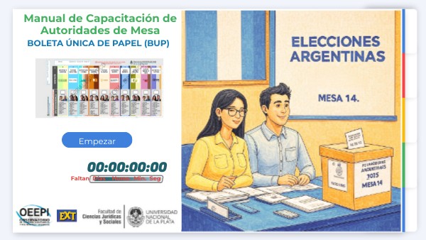 El Observatorio de Estudios Electorales y Político Institucionales (OEEPI) de la Facultad de Ciencias Jurídicas y Sociales de la Universidad Nacional de La Plata se enorgullece en presentar el Primer Manual para Autoridades de Mesas Receptoras de Votos interactivo. Este manual está dirigido además de a las autoridades de mesa designadas para la elección del próximo 26 de octubre, para electores en general, las y los fiscales, apoderados/as de agrupaciones políticas. El objetivo principal de este manual es capacitar a quienes ejerzan la función de Presidente/a o Vocal de Mesa, ofreciéndoles la normativa electoral necesaria. Sin embargo, su propósito va más allá: busca educar cívicamente a la población en sus derechos y obligaciones como electorado activo y pasivo. La última parte del manual es una herramienta práctica y completa, diseñada para ayudar a resolver dudas y acceder a información clave. Respuestas a preguntas frecuentes: una sección de guía rápida para resolver tus dudas al instante. Validación de conocimientos: ejercicios prácticos para reforzar lo aprendido y asegurarte de estar preparado Esta herramienta está diseñada para que cumplas tu rol de la mejor manera. Prof. Sebastián López Calendino Sub Director del OEEPI