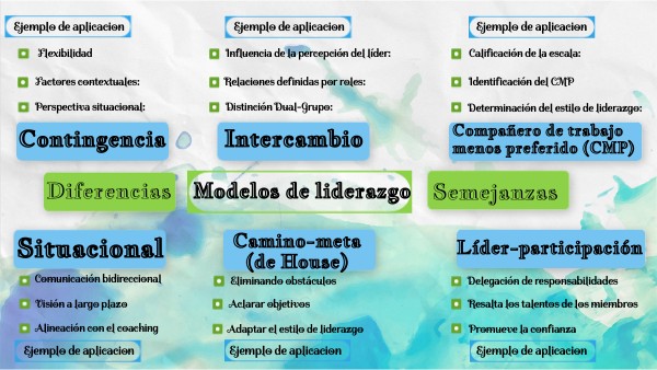 Capacidad de establecer metas y objetivos: Todos los modelos de liderazgo implican la formulación de una visión clara y el establecimiento de objetivos y metas que el equipo debe alcanzar. Toma de decisiones: La capacidad de tomar decisiones, ya sea unilateralmente o en colaboración, es una habilidad presente en todos los modelos de liderazgo. Enfoque en el éxito a largo plazo: Muchos modelos de liderazgo, como los orientados a la visión o al crecimiento, comparten un enfoque en el éxito a largo plazo de la organización. Responsabilidad por el equipo y los resultados: Cada modelo, en su forma de liderazgo, es responsable de guiar a un equipo hacia la consecución de objetivos y de asegurar la eficiencia del trabajo. Comunicación efectiva: La capacidad de comunicarse, tanto verbalmente como a través de la escucha activa, es fundamental para todos los líderes y modelos, asegurando la claridad y el entendimiento dentro del equipo. Inspiración y motivación: Un líder debe ser capaz de inspirar y motivar a los miembros de su equipo, aunque los métodos para lograrlo varíen entre los diferentes modelos.