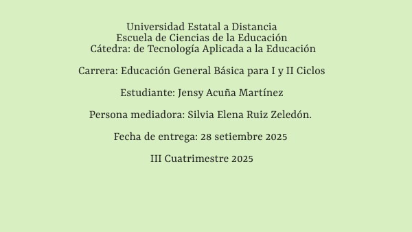 Universidad Estatal a Distancia Escuela de Ciencias de la Educación Cátedra: de Tecnología Aplicada a la Educación Carrera: Educación General Básica para I y II Ciclos Estudiante: Jensy Acuña Martínez Persona mediadora: Silvia Elena Ruiz Zeledón. Fecha de entrega: 28 setiembre 2025 III Cuatrimestre 2025