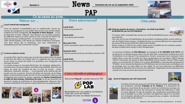 Le forum santé de rentrée La rentrée 2025 a été l'occasion pour le lycée Pierre Adrien Pâris de placer le bien-être des élèves au premier plan en organisant son tout premier Forum Santé, un temps fort dédié à la prévention et à l’intégration des nouveaux arrivants.La rentrée marque un tournant décisif pour de nombreux adolescents : nouveaux lieux, nouveaux repères, nouvelles responsabilités. Mais face aux enjeux de santé qui touchent de plus en plus les jeunes – stress, addictions, isolement, mal-être... – il est essentiel qu’ils sachent dès leur arrivée vers qui se tourner. Près de 120 élèves de seconde, de 3e Prépa-Métiers et de premières années de CAP ont donc participé à cette journée d’intégration pas comme les autres, organisée par Marion Grandvincent et aidée de Nora Doutaz, infirmières du lycée. Ils ont pu rencontrer les structures locales de prévention et d’accompagnement, découvrir leurs missions et bénéficier d’un premier contact direct avec les professionnels.