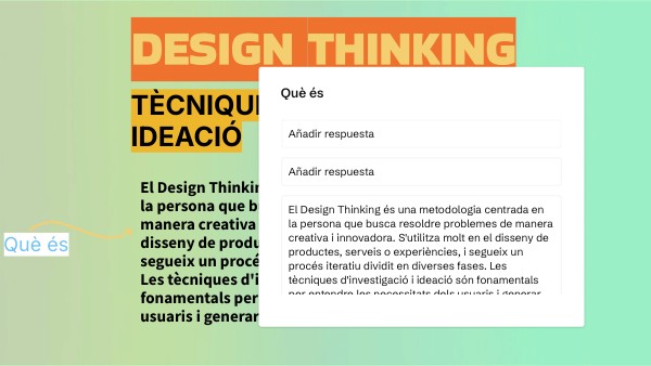 El Design Thinking és una metodologia centrada en la persona que busca resoldre problemes de manera creativa i innovadora. S'utilitza molt en el disseny de productes, serveis o experiències, i segueix un procés iteratiu dividit en diverses fases. Les tècniques d'investigació i ideació són fonamentals per entendre les necessitats dels usuaris i generar solucions creatives.