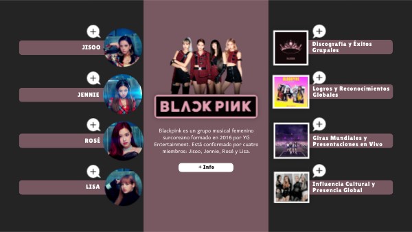 Blackpink es un grupo musical femenino surcoreano formado en 2016 por YG Entertainment. Está conformado por cuatro miembros: Jisoo, Jennie, Rosé y Lisa.