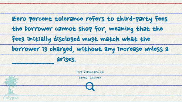 Zero percent tolerance refers to third-party fees the borrower cannot shop for, meaning that the fees initially disclosed must match what the borrower is charged, without any increase unless a __________ arises.