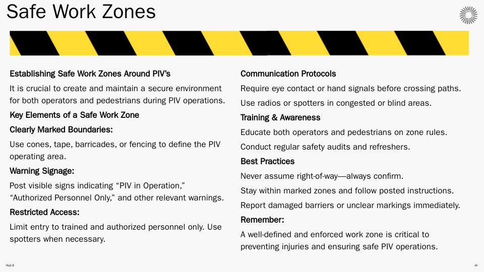 Communication Protocols Require eye contact or hand signals before crossing paths. Use radios or spotters in congested or blind areas. Training & Awareness Educate both operators and pedestrians on zone rules. Conduct regular safety audits and refreshers. Best Practices Never assume right-of-way—always confirm. Stay within marked zones and follow posted instructions. Report damaged barriers or unclear markings immediately. Remember: A well-defined and enforced work zone is critical to preventing injuries and ensuring safe PIV operations.