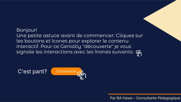 Bonjour! Une petite astuce avant de commencer: Cliquez sur les boutons et îcones pour explorer le contenu interactif. Pour ce Genially "découverte" je vous signale les interactions avec les înones suivants: