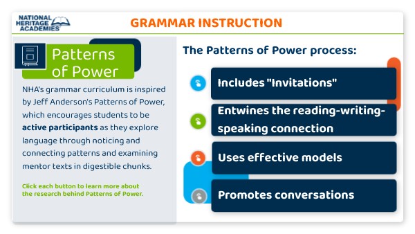 NHA's grammar curriculum is inspired by Jeff Anderson's Patterns of Power, which encourages students to be active participants as they explore language through noticing and connecting patterns and examining mentor texts in digestible chunks.