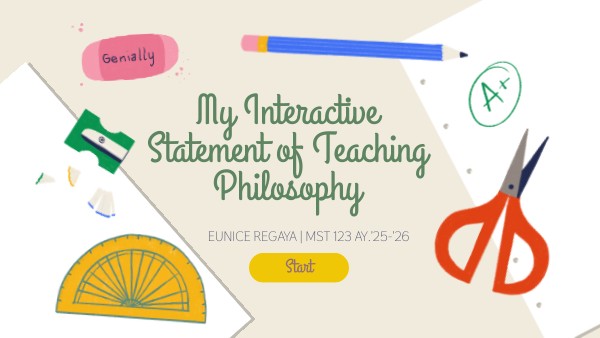 I will be a facilitator, mentor, and co-learner rather than the traditional "sage on the stage," but someone who guides students as they construct their own understanding and discover their potential. My approach seamlessly blends multiple educational theories to create engaging, meaningful learning experiences: constructivism, where students actively build knowledge through guided discovery much like this interactive escape room/game presentation strategy, where learners navigate challenges to construct knowledge rather than passively receive information; Vygotsky's social learning theory emphasizing collaboration, Gardner's multiple intelligences honoring diverse learning styles, progressivism through hands-on problem-solving, existentialism by helping students find personal meaning in their learning, humanism by recognizing each student's inherent worth, and information processing theories to accommodate different cognitive approaches. As a Filipino educator understanding our classroom realities—managing 40-50 students with limited resources, and supporting students who work part-time or help their families—I'll incorporate cultural values like pakikipagkapwa and bayanihan spirit, creating classrooms where students support each other and learn collaboratively because they understand struggle, and where respect is earned through genuine care rather than fear. I won't be the intimidating 'Ma'am' demanding silence from the front. Instead, I'll be their caring 'Ate' or second mom, someone who understands them. I want to be someone they can reach out to, express themselves freely, and share their concerns and struggles. I will be kind and always open to listening while ensuring that respect flows both ways and learning becomes a two-way street where we grow together. I want to extend help in every way possible, providing support, advice, and sharing wisdom about life. My friends often say I have the ability to make them reflect after our conversations. I want my students to experience this same gift of reflection and understanding, helping them not just learn subjects but live their lives better. I commit to being both deeply empathetic and highly competent. While I'll understand my students' backgrounds and challenges, I'll also continuously improve my teaching skills and subject mastery to deliver lessons clearly, confidently, and engagingly. Learning should be fun and exciting, making every student eager to attend class, participate in discussions, and engage in active learning. I want to be remembered as a teacher who perfectly balanced empathy and humanity with professional expertise and effectiveness. I want them to remember both how I made them feel in my classroom and how skillfully I delivered lessons. Most importantly, I want to be someone they looked up to as both a professional teacher and a life companion who genuinely cared about their growth as whole human beings.