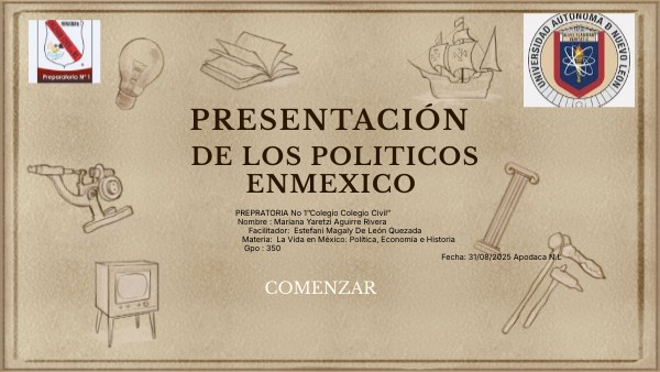 PREPRATORIA No 1”Colegio Colegio Civil” Nombre : Mariana Yaretzi Aguirre Rivera Facilitador: Estefani Magaly De León Quezada Materia: La Vida en México: Política, Economía e Historia Gpo : 350 Fecha: 31/08/2025 Apodaca N.L