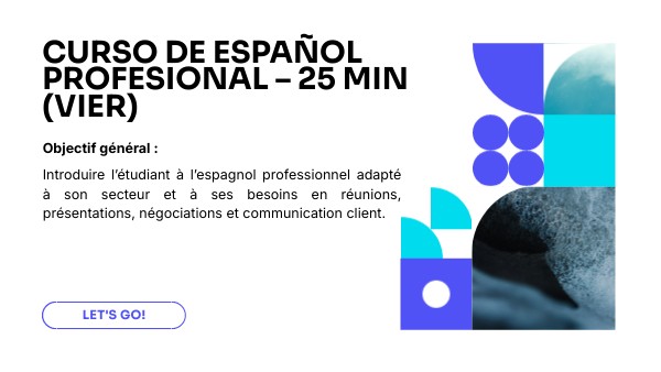 Objectif général : Introduire l’étudiant à l’espagnol professionnel adapté à son secteur et à ses besoins en réunions, présentations, négociations et communication client.