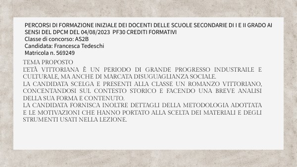 TEMA PROPOSTO L'età vittoriana è un periodo DI GRANDE PROGRESSO INDUSTRAILE E CULTURALE, MA ANCHE DI MARCATA DISUGUAGLIANZA SOCIALE. lA CANDIDATA SCELGA E PRESENTI ALLA CLASSE UN ROMANZO VITTORIANO, CONCENTANDOSI SUL CONTESTO STORICO E FACENDO UNA BREVE ANALisi DELLA SUA FORMA E CONTENUTO. LA CANDIDATA FORNISCA INOLTRE DETTAGLI DELLA METODOLOGIA ADOTTATA E LE MOTIVAZIONI CHE HANNO PORTATO ALLA SCELTA DEI MATERIALI E DEGLI STRUMENTI USATI NELLA LEZIONE.