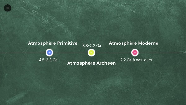 Atmosphère moderne : L'oxygène a ensuite envahi l'atmosphère (Grande Oxydation), la façonnant jusqu'à l'équilibre que nous connaissons aujourd'hui, permettant le développement de la vie complexe.