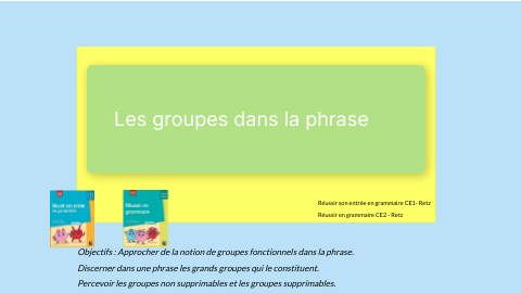 Objectifs : Approcher de la notion de groupes fonctionnels dans la phrase. Discerner dans une phrase les grands groupes qui le constituent. Percevoir les groupes non supprimables et les groupes supprimables.