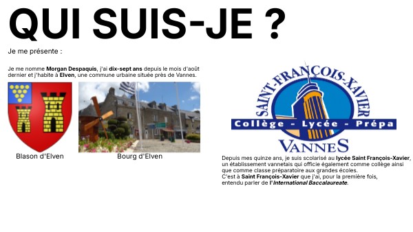Je me nomme Morgan Despaquis, j'ai dix-sept ans depuis le mois d'août dernier et j'habite à Elven, une commune urbaine située près de Vannes.