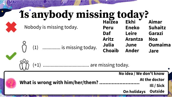 (1) .............. is missing today. (+1) .................................... are missing today.
