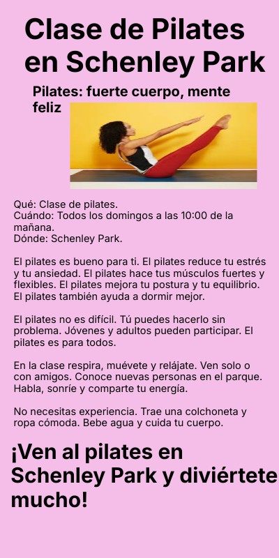Qué: Clase de pilates. Cuándo: Todos los domingos a las 10:00 de la mañana. Dónde: Schenley Park. El pilates es bueno para ti. El pilates reduce tu estrés y tu ansiedad. El pilates hace tus músculos fuertes y flexibles. El pilates mejora tu postura y tu equilibrio. El pilates también ayuda a dormir mejor. El pilates no es difícil. Tú puedes hacerlo sin problema. Jóvenes y adultos pueden participar. El pilates es para todos. En la clase respira, muévete y relájate. Ven solo o con amigos. Conoce nuevas personas en el parque. Habla, sonríe y comparte tu energía. No necesitas experiencia. Trae una colchoneta y ropa cómoda. Bebe agua y cuida tu cuerpo.