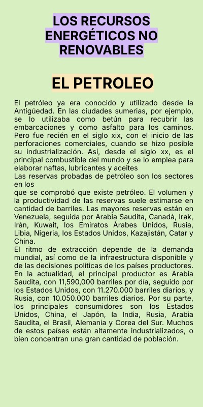 El petróleo ya era conocido y utilizado desde la Antigúedad. En las ciudades sumerias, por ejemplo, se lo utilizaba como betún para recubrir las embarcaciones y como asfalto para los caminos. Pero fue recién en el siglo xix, con el inicio de las perforaciones comerciales, cuando se hizo posible su industrialización. Así, desde el siglo xx, es el principal combustible del mundo y se lo emplea para elaborar naftas, lubricantes y aceites Las reservas probadas de petróleo son los sectores en los que se comprobó que existe petróleo. El volumen y la productividad de las reservas suele estimarse en cantidad de barriles. Las mayores reservas están en Venezuela, seguida por Arabia Saudita, Canadá, Irak, Irán, Kuwait, los Emiratos Árabes Unidos, Rusia, Libia, Nigeria, los Estados Unidos, Kazajistán, Catar y China. El ritmo de extracción depende de la demanda mundial, así como de la infraestructura disponible y de las decisiones políticas de los países productores. En la actualidad, el principal productor es Arabia Saudita, con 11,590,000 barriles por día, seguido por los Estados Unidos, con 11.270.000 barriles diarios, y Rusia, con 10.050.000 barriles diarios. Por su parte, los principales consumidores son los Estados Unidos, China, el Japón, la India, Rusia, Arabia Saudita, el Brasil, Alemania y Corea del Sur. Muchos de estos países están altamente industrializados, o bien concentran una gran cantidad de población.