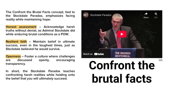 The Confront the Brutal Facts concept, tied to the Stockdale Paradox, emphasizes facing reality while maintaining hope: Honest assessment – Acknowledge harsh truths without denial, as Admiral Stockdale did while enduring brutal conditions as a POW. Resilient faith – Maintain belief in ultimate success, even in the toughest times, just as Stockdale believed he would survive. Openness – Foster a culture where challenges are discussed openly, encouraging transparency. In short, the Stockdale Paradox teaches confronting harsh realities while holding onto the belief that you will ultimately succeed.