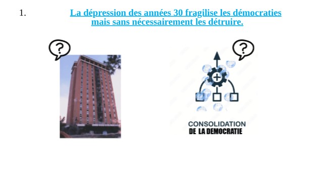 La dépression des années 30 fragilise les démocraties mais sans nécessairement les détruire.
