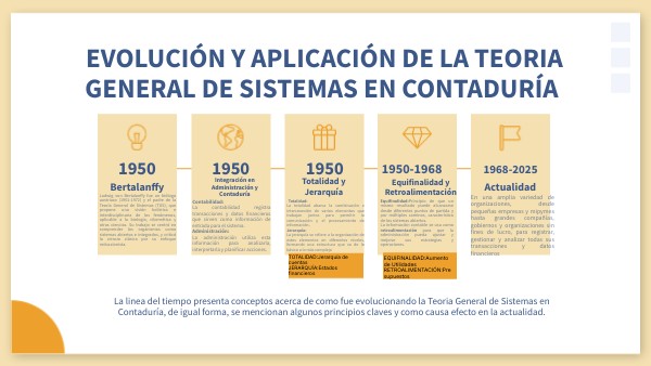 La linea del tiempo presenta conceptos acerca de como fue evolucionando la Teoria General de Sistemas en Contaduría, de igual forma, se mencionan algunos principios claves y como causa efecto en la actualidad.