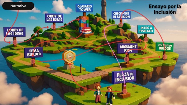 En este mapa verán diferentes mundos: empezaremos en el Lobby de las Ideas, donde pensaremos qué es la discriminación. Luego, pasaremos por el Obby de Conceptos y la Glosario Tower, donde aprenderemos a reconocer los diferentes tipos de discriminación. Más adelante llegaremos a la Ensayo Arena y construiremos paso a paso nuestro propio ensayo