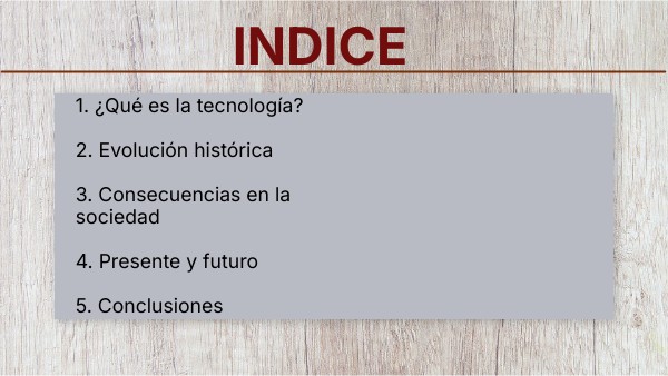 1. ¿Qué es la tecnología? 2. Evolución histórica 3. Consecuencias en la sociedad 4. Presente y futuro 5. Conclusiones