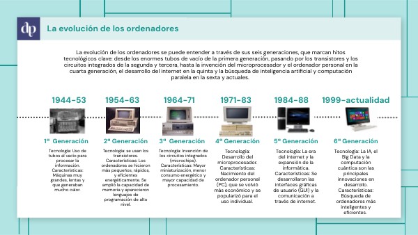 La evolución de los ordenadores se puede entender a través de sus seis generaciones, que marcan hitos tecnológicos clave: desde los enormes tubos de vacío de la primera generación, pasando por los transistores y los circuitos integrados de la segunda y tercera, hasta la invención del microprocesador y el ordenador personal en la cuarta generación, el desarrollo del internet en la quinta y la búsqueda de inteligencia artificial y computación paralela en la sexta y actuales.