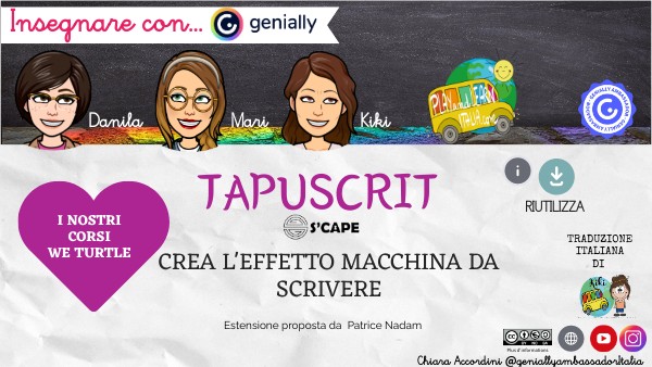 Nella pagina seguente troverai alcuni esempi riutilizzabili e una pagina di creazione vuota. Usare questa estensione è semplice. Importa la pagina di creazione nel tuo Genially Inserisci il tuo testo in questo spazio. Modifica lo stile di formattazione del carattere ( non inserire capolinea ) Modifica se vuoi la velocità di entrata e scorrimento. Fatto!