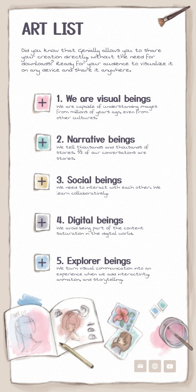 Did you know that Genially allows you to share your creation directly, without the need for downloads? Ready for your audience to view it on any device and share it anywhere.When giving a presentation, two objectives must be pursued: conveying information and avoiding yawns. To achieve this, it can be a good practice to create an outline and use words that stick in your audience's mind.