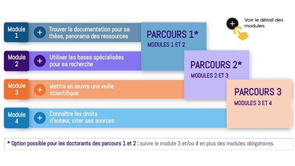 * Option possible pour les doctorants des parcours 1 et 2 : suivre le module 3 et/ou 4 en plus des modules obligatoires.