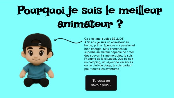 Ça c'est moi : Jules BELLIOT, À 16 ans, je suis un animateur en herbe, prêt à répendre ma passion et mon énergie. Si tu cherches un superbe animateur capable de créer des souvernirs mémorables, je suis l'homme de la situation.