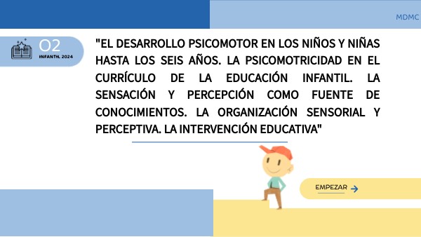 "EL DESARROLLO PSICOMOTOR EN LOS NIÑOS Y NIÑAS HASTA LOS SEIS AÑOS. LA PSICOMOTRICIDAD EN EL CURRÍCULO DE LA EDUCACIÓN INFANTIL. LA SENSACIÓN Y PERCEPCIÓN COMO FUENTE DE CONOCIMIENTOS. LA ORGANIZACIÓN SENSORIAL Y PERCEPTIVA. LA INTERVENCIÓN EDUCATIVA"