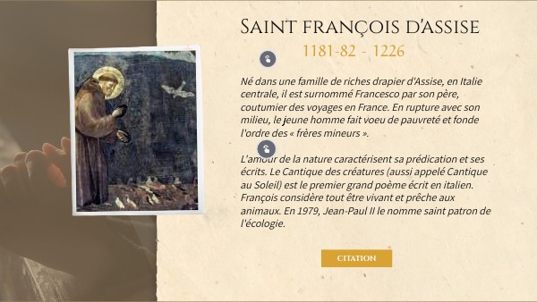 Né dans une famille de riches drapier d'Assise, en Italie centrale, il est surnommé Francesco par son père, coutumier des voyages en France. En rupture avec son milieu, le jeune homme fait voeu de pauvreté et fonde l'ordre des « frères mineurs ».L'amour de la nature caractérisent sa prédication et ses écrits. Le Cantique des créatures (aussi appelé Cantique au Soleil) est le premier grand poème écrit en italien. François considère tout être vivant et prêche aux animaux. En 1979, Jean-Paul II le nomme saint patron de l'écologie.