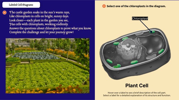 The castle garden soaks in the sun’s warm rays, Like chloroplasts in cells on bright, sunny days. Look closer—each plant in the garden you see, Has cells with chloroplasts, working endlessly. Answer the questions about chloroplasts to prove what you know, Complete the challenge and let your journey grow!