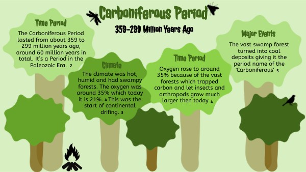 The Carboniferous Period lasted from about 359 to 299 million years ago, around 60 million years in total. It’s a Period in the Paleozoic Era.