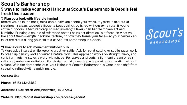 1) Plan your look with lifestyle in mind Before you sit in the chair, think about how you spend your week. If you’re in and out of meetings, a clean, tapered silhouette keeps things polished without extra fuss. If you’re active outdoors, a textured crop or medium-length layers can handle movement and humidity. Bringing a couple of reference photos helps set direction, but focus on what you like about them—length, neckline, texture, or how they frame your face—so your barber can tailor the result during your Haircut at Scout's Barbershop in Geodis. 2) Use texture to add movement without bulk Texture adds interest while keeping a cut versatile. Ask for point cutting or subtle razor work to break up density and encourage natural flow. This approach works on straight, wavy, and curly hair, helping styles air-dry with shape. For waves and curls, a light curl cream or sea salt spray enhances definition. For straighter hair, a matte paste provides separation without weight. With the right technique, your Haircut at Scout's Barbershop in Geodis can shift from casual to refined with a quick restyle. Contact Us: Phone : (615) 412-3582 Address: 439 Benton Ave, Nashville, TN 37204 Website: http://scoutsbarbershop.com/scouts-geodis/