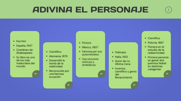 Trata de identificar el personaje antes de voltear la tarjeta. Si aciertas, haz clic en el signo ✔, y si te equivocas, selecciona ✖.