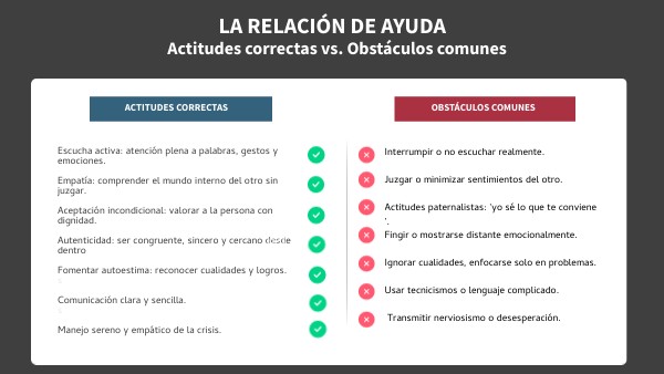 Escucha activa: atención plena a palabras, gestos y emociones. Empatía: comprender el mundo interno del otro sin juzgar. Aceptación incondicional: valorar a la persona con dignidad. Autenticidad: ser congruente, sincero y cercano desde dentro Fomentar autoestima: reconocer cualidades y logros. s Comunicación clara y sencilla. s Manejo sereno y empático de la crisis.