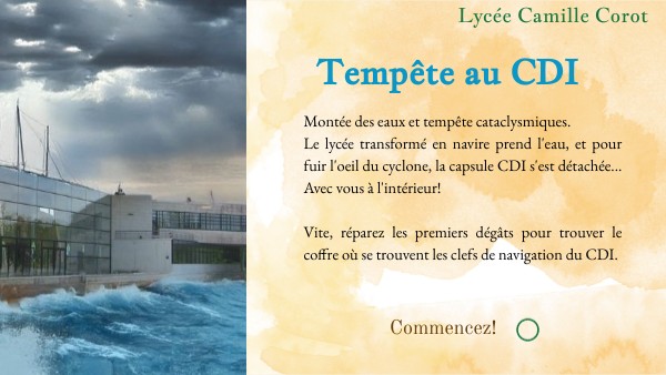 Montée des eaux et tempête cataclysmiques. Le lycée transformé en navire prend l'eau, et pour fuir l'oeil du cyclone, la capsule CDI s'est détachée... Avec vous à l'intérieur! Vite, réparez les premiers dégâts pour trouver le coffre où se trouvent les clefs de navigation du CDI.