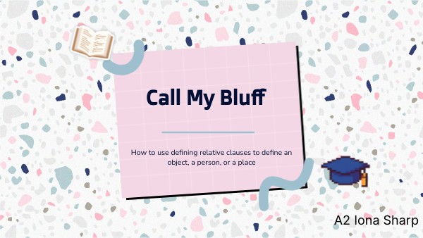 1) In your group, choose three unusual words that you think no one else in the class will know. One word must refer to a thing (object), one to a person, and one to a place. You can look for these online. 2) Write three definitions for each word using defining relative clauses and the correct relative pronoun. Remember: only one definition should be correct—the other two must be incorrect. 3) Notice: after the pronouns which and who, we use a verb; after the pronoun where, we always need a subject. 4)The pronouns which and who can be replaced with that. 5) Quiz the rest of the class to see if they can guess your correct definitions!
