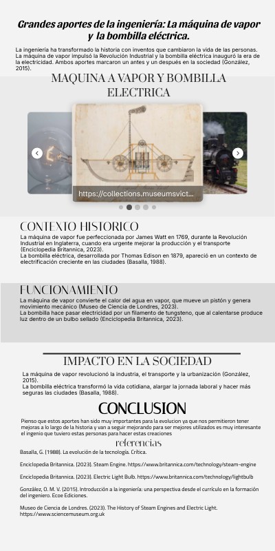 La ingeniería ha transformado la historia con inventos que cambiaron la vida de las personas. La máquina de vapor impulsó la Revolución Industrial y la bombilla eléctrica inauguró la era de la electricidad. Ambos aportes marcaron un antes y un después en la sociedad (González, 2015).