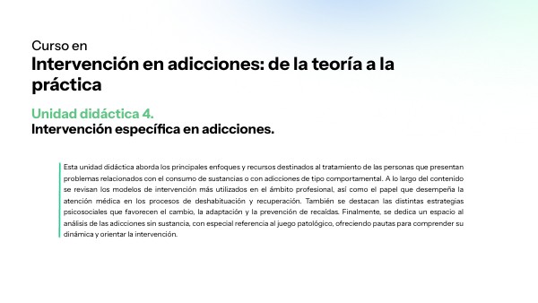 Esta unidad didáctica aborda los principales enfoques y recursos destinados al tratamiento de las personas que presentan problemas relacionados con el consumo de sustancias o con adicciones de tipo comportamental. A lo largo del contenido se revisan los modelos de intervención más utilizados en el ámbito profesional, así como el papel que desempeña la atención médica en los procesos de deshabituación y recuperación. También se destacan las distintas estrategias psicosociales que favorecen el cambio, la adaptación y la prevención de recaídas. Finalmente, se dedica un espacio al análisis de las adicciones sin sustancia, con especial referencia al juego patológico, ofreciendo pautas para comprender su dinámica y orientar la intervención.