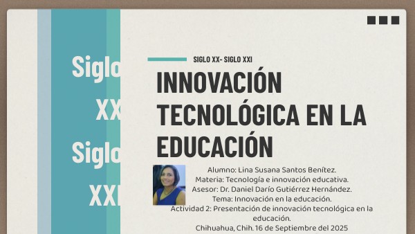 Alumno: Lina Susana Santos Benítez.Materia: Tecnología e innovación educativa.Asesor: Dr. Daniel Darío Gutiérrez Hernández.Tema: Innovación en la educación. Actividad 2: Presentación de innovación tecnológica en la educación. Chihuahua, Chih. 16 de Septiembre del 2025