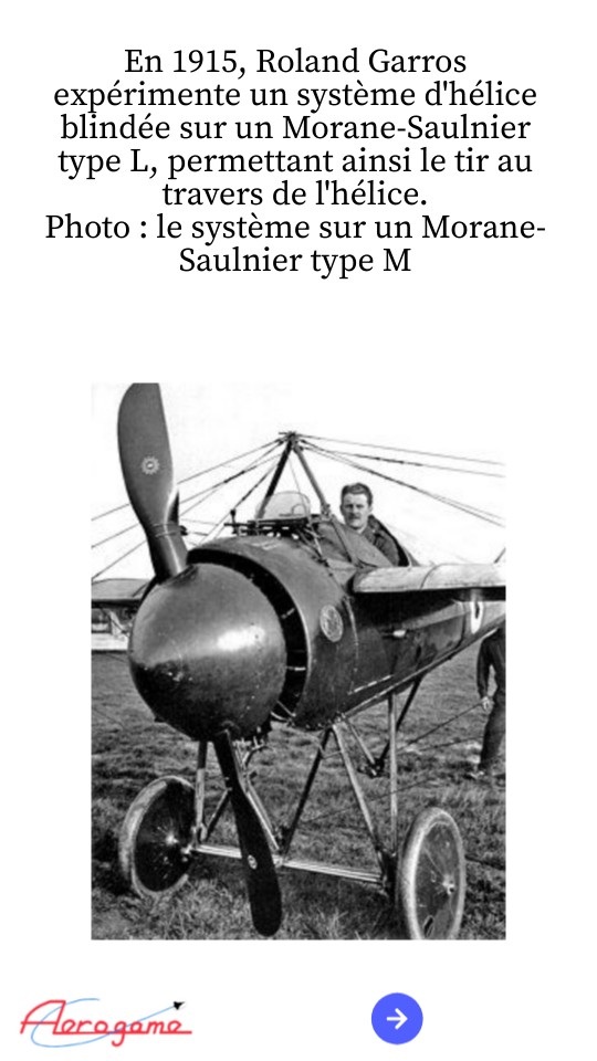 En 1915, Roland Garros expérimente un système d'hélice blindée sur un Morane-Saulnier type L, permettant ainsi le tir au travers de l'hélice. Photo : le système sur un Morane-Saulnier type M