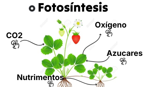 Se representa un ejemplo del proceso de fotsíntesis en una planta de fresa. Se destacan los principales elementos que intervienen en el proceso.
