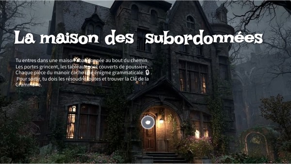 Tu entres dans une maison abandonnée au bout du chemin. Les portes grincent, les tableaux sont couverts de poussière… Chaque pièce du manoir cache une énigme grammaticale 🔒. Pour sortir, tu dois les résoudre toutes et trouver la Clé de la Grammaire.