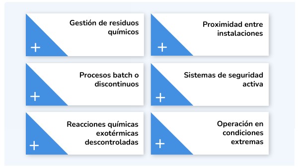 Los procesos batch o discontinuos presentan patrones de riesgo variables según las fases de producción, con picos de peligrosidad durante las operaciones de carga de reactivos y descarga de productos. La flexibilidad de estas instalaciones para fabricar diferentes productos incrementa la complejidad del análisis de riesgo, ya que cada campaña de producción puede implicar combinaciones distintas de sustancias peligrosas.