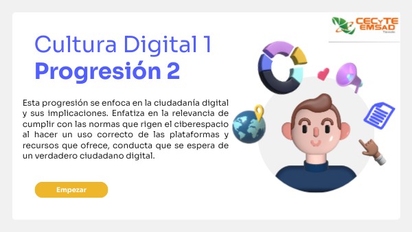 Esta progresión se enfoca en la ciudadanía digital y sus implicaciones. Enfatiza en la relevancia de cumplir con las normas que rigen el ciberespacio al hacer un uso correcto de las plataformas y recursos que ofrece, conducta que se espera de un verdadero ciudadano digital.