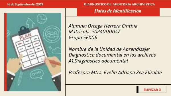 Alumna: Ortega Herrera Cinthia Matrícula: 20240D0047 Grupo 5EX06 Nombre de la Unidad de Aprendizaje: Diagnostico documental en los archivos A1.Diagnostico documental Profesora Mtra. Evelin Adriana Zea Elizalde
